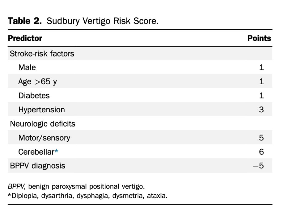 More recently, a clinical decision rule (CDR) called the Sudbury Vertigo Risk Score